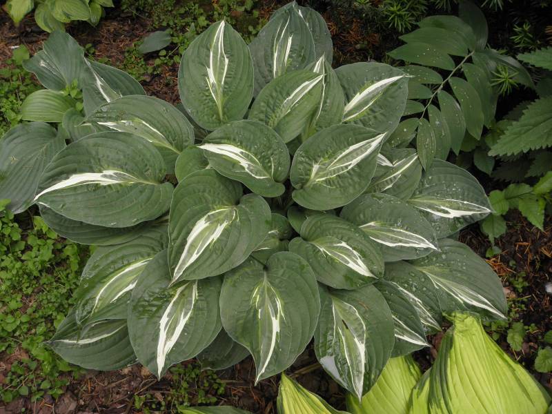 Liście: sercowate, o wymiarach 18 x 13 cm, ostro zakończone; jaśniejsze(najpierw zielone, potem zmienia się niemal w kremowe) centrum otoczone zielonym marginesem, który oddzielony jest od niego białą nitką