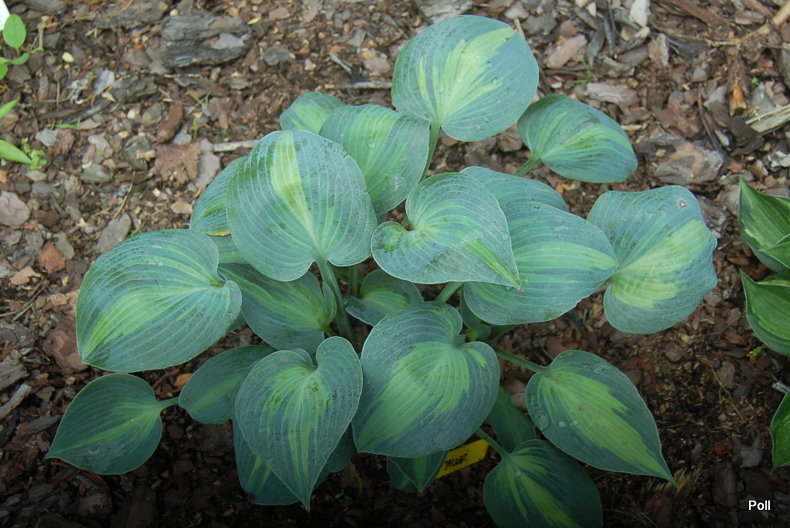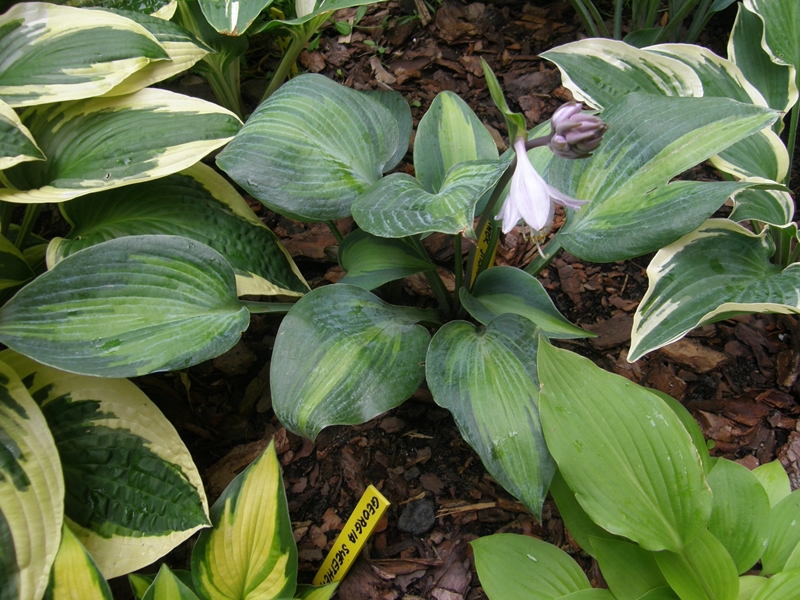 Rozmiar SM wysokość 35-40cm Liście: mocne,podłużne; żółte, wyraźne centrum otoczone niebieskoszmaragdowym ( wiosną - jakby przypudrowanym) marginesem Kwiaty: jasnolawendowe ( k.VII/VII) Zalecane stanowisko: od półcienia