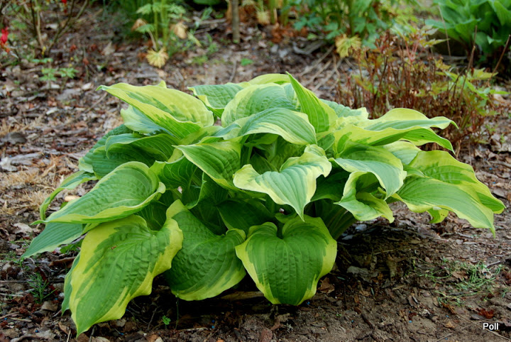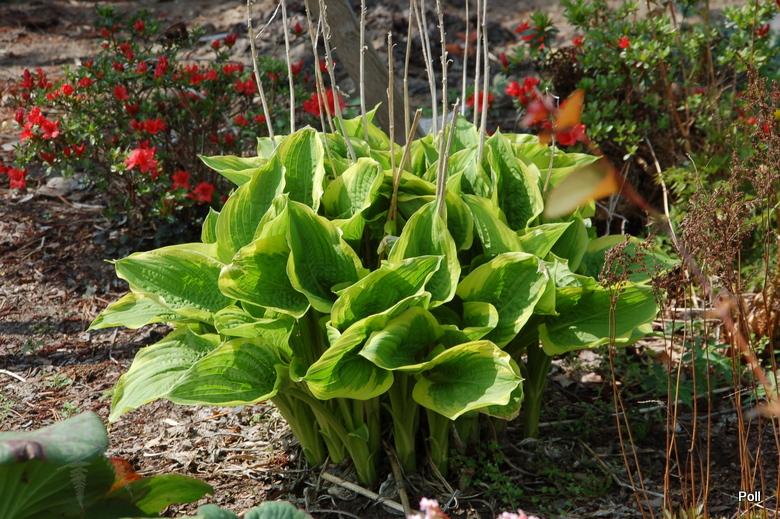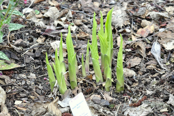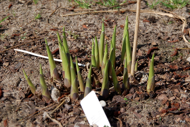 Zdjęcie Poll z kwietnia i maja 2016 r. Roślina rozpoczynająca 4-ty (?)sezon, kupiona jako 1 kłowa sadzonka z in vitro (Fransen). Jej tempo przyrastania wydaje mi się niezłe - od 1 do 14 kłów w tym roku.