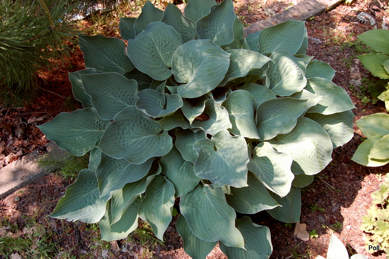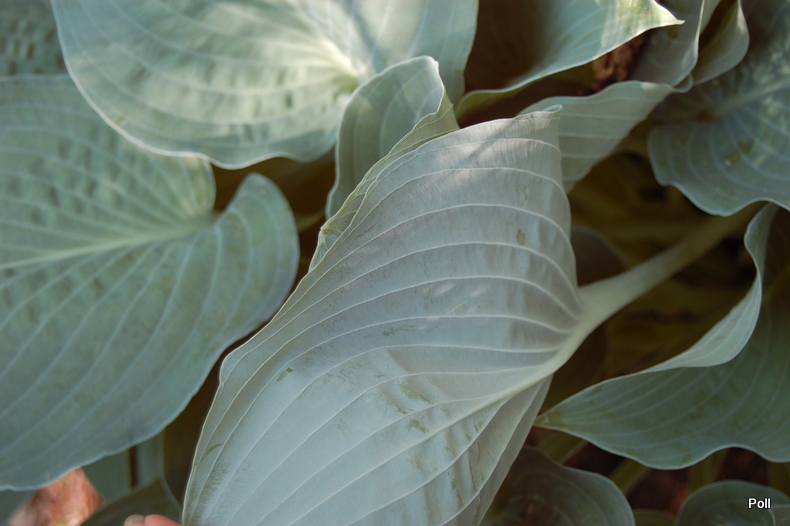 Liście: intensywnie szaroniebieskie, lekko burchlaste ; sercowate o łagodnie falującym brzegu i jaśniejszych, wyraźnych nerwach , bardzo charakterystyczne; przypudrowany back