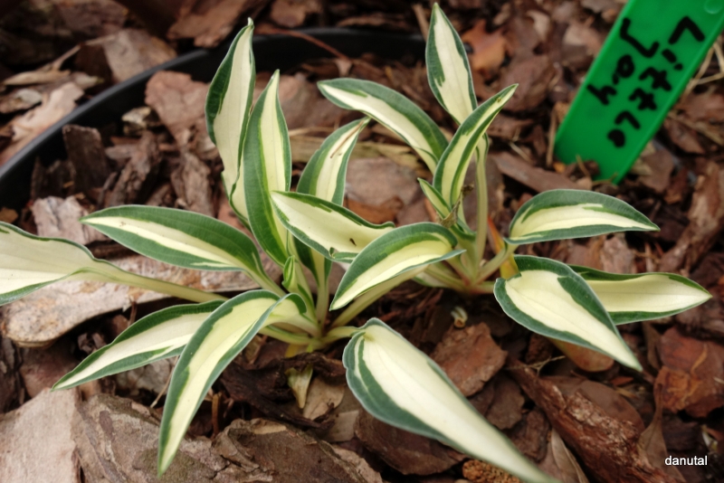 Rozmiar: D/S wysokość 10-15cm Liście: kremowobiałe centrum z wąskim zielonym marginesem Kwiaty: jasno-lawendowy w lipcu/sierpniu Zalecane stanowisko: półcień do cienia Uwagi:
