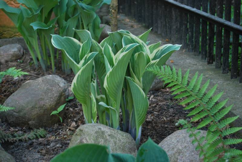 Hosta Tom Schmid wystartowała dość energicznie. Drugi rok u mnie, na jesieni zmieniła pierwotną lokalizację (siedziała pod świerkiem, tu na rabacie pod domem będzie jej lepiej).