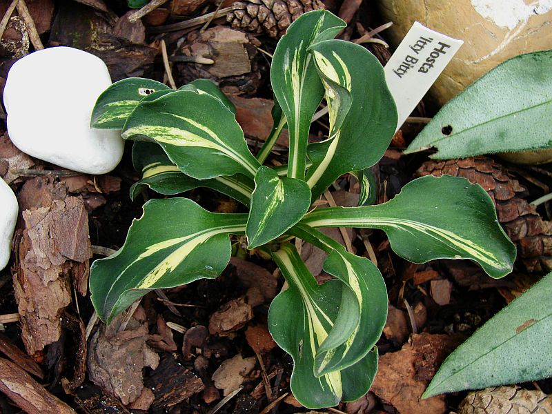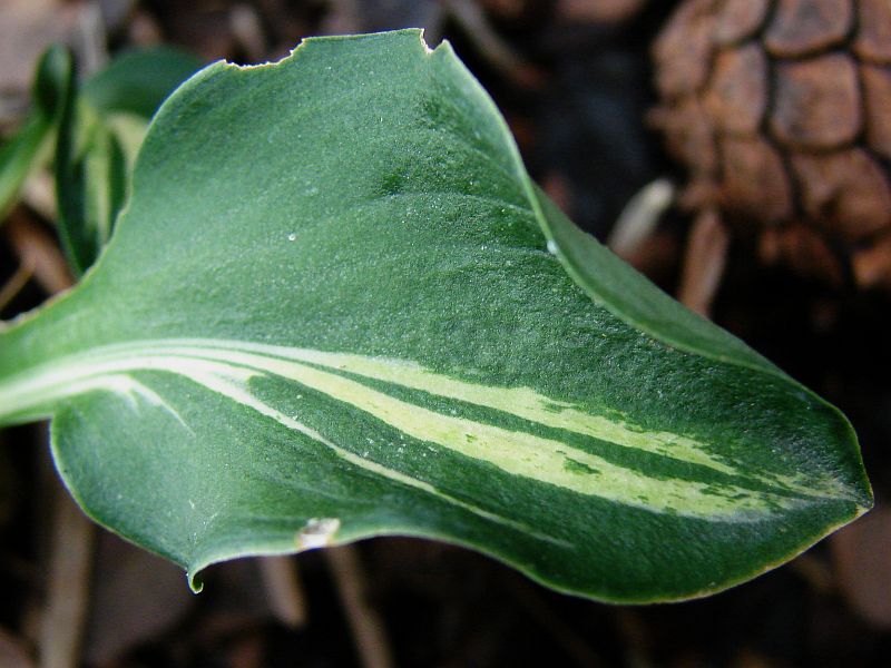 Liście: podłużne, lekko falowane, twarde... ciemnozielone z białym centrum przechodzącym na łodygi... centrum nie jest w pełni stabilne, latem potrafi przybierać formę streaked... również w jego obrębie mogę pojawiać się zielonkawe przebarwienia