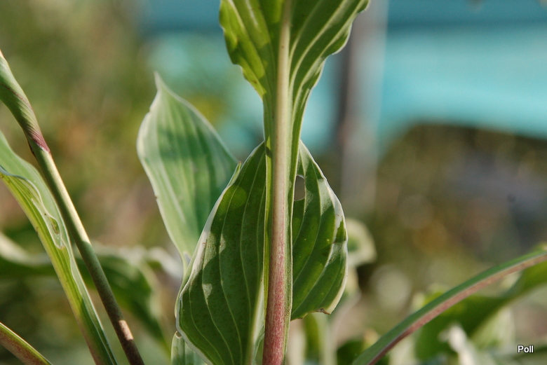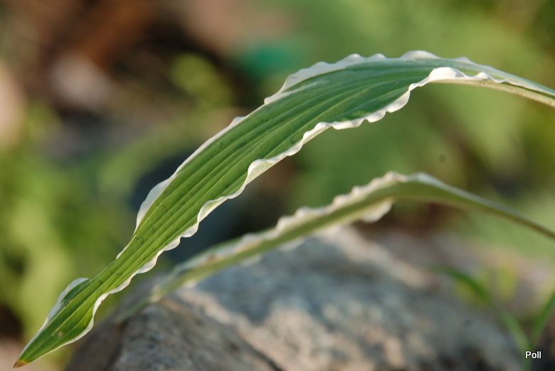 Rozmiar: M (osiaga wysokość około 35-40 cm) Liście: wąskie, wydłużone, zielone z mocno falującym białym marginesem, osadzone na czerwono nakrapianych ogonkach liściowych Kwiaty: lawendowe, okres kwitnienia przypada na koniec VII/ początek VIII Zalecane stanowisko: półcień/cień