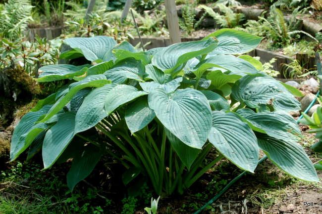Wyobraźcie sobie w swoim ogrodzie rozłożystą roślinę , która rozsiadając się, jako soliter na cienistym trawniku, zajmuje miejsce o ok. 2,5 metrowej szerokości a jej liście osiagają 70 cm długości. Takiej hosty jeszcze nie było na rynku , więc introdukcja Skaggsów zrobiła prawdziwą furorę , choć nie jest papugowato kolorowa: jej liście mają ciemnozieloną barwę i są lekko błyszczące a od spodu sinawe . Także kwiaty nie są urodziwe - rozwijają się na przełomie VI/VII i są jasnolawendowe osadzone na długich łodygach . Ja wycinałam je , gdy roślina była młoda, aby nie traciła energii na zawiązywanie nasion. Teraz zostawiam nasienniki, licząc , że wśród przypadkowych siewek pojawi się jakaś ciekawa, które chwyci mnie za serce . Wielkim plusem Empress Wu, jest jej duża dynamika wzrostu , o czym pisałam w pierwszym poście/wstępniaku. W tworzeniu nowych kłów (zagęszczaniu) jest nieco wolniejsza - corocznie , przybywa średnio jeden kieł . Duże liście powodują jednak,że od niemal początku, tworzona kępa wydaje się wiele większa i bardziej gęsta, niż faktycznie ma to miejsce.
