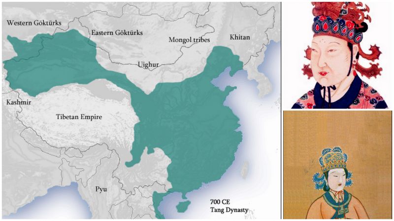 Dwa wizerunki cesarzowej Empress Wu i zasięg jej imperium
