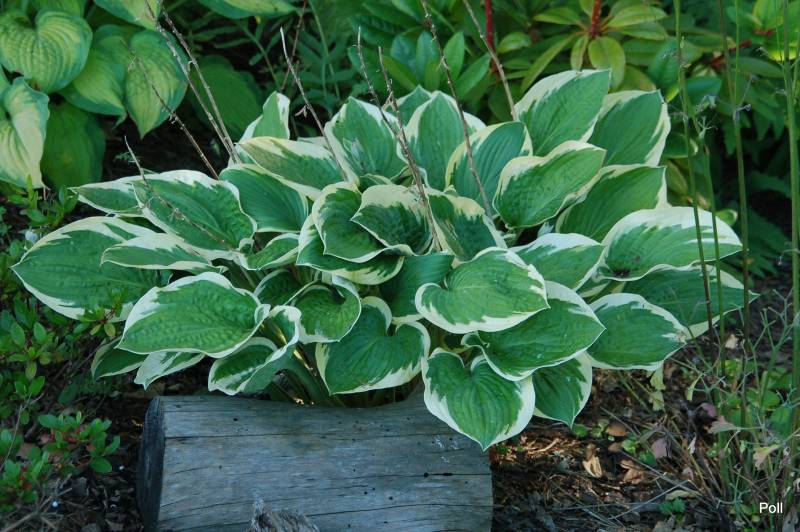 Hosta na zdjęciach ma 4 lata, ale prawdę powiedziawszy, niewiele mogę o niej napisać. Póki co, nie wyróżnia się niczym szczególnym.Wiosną liście mają nieo niebieskawą barwę, potem świetliście jasnozieloną a margines z żółtawego, robi się stopniowo jasniejszy. Na poprzednim stanowisku, które było zbyt słoneczne, margines nie wybarwiał się równomiernie, czego nie znoszę. Przeniosłam więc ją na bardziej cieniste , jak widać prezentuje się lepiej. Jeśli ma pokazać jakieś niezauważone przeze mnie cechy, powinna była to zrobić w ubiegłym roku - był to jej 5ty sezon, więc najwyższy czas. Póki co, odnotowałam ładną symetryczność sercowatych liści, które robią się nieco burchlaste. Jej nazwa "Sea Beacon" oznacza latarnię morską, wskazywałoby to, iż powinna 'świecić' wśród host, przyciągać wzrok kolorem.