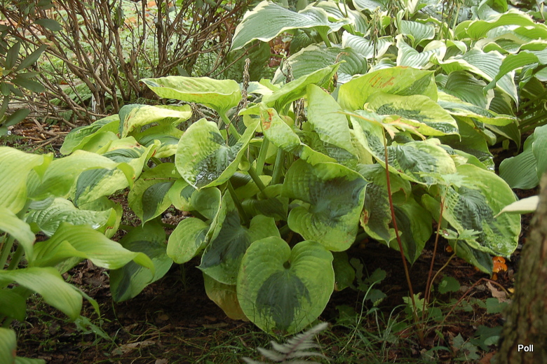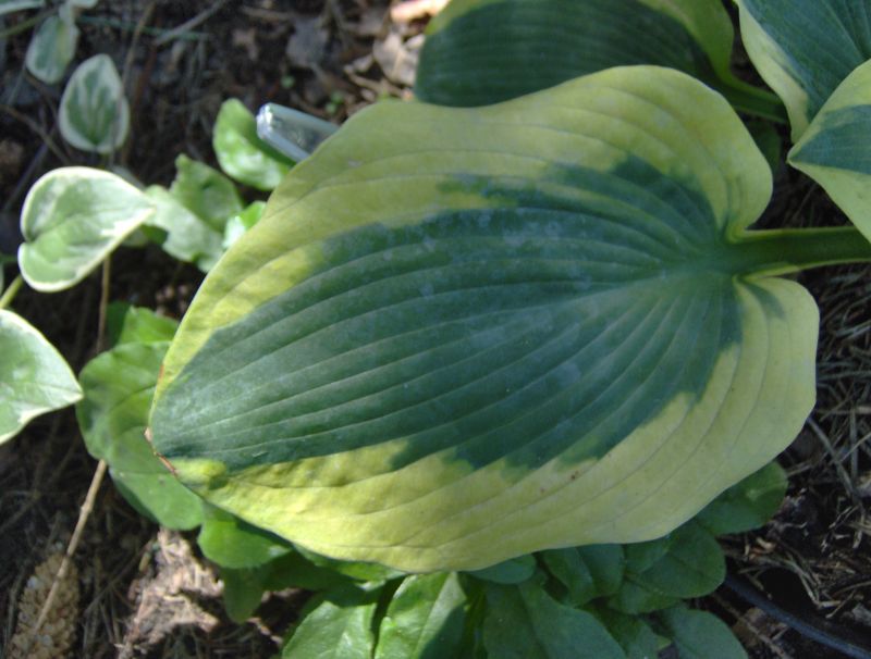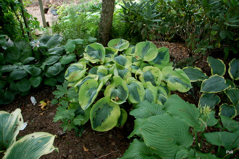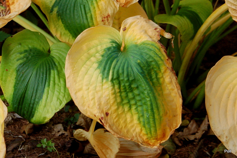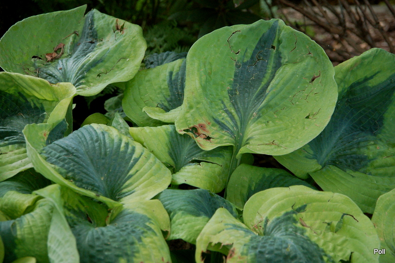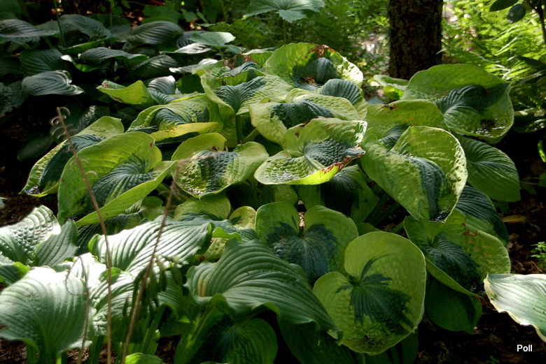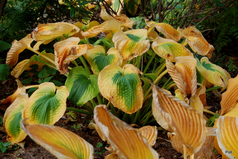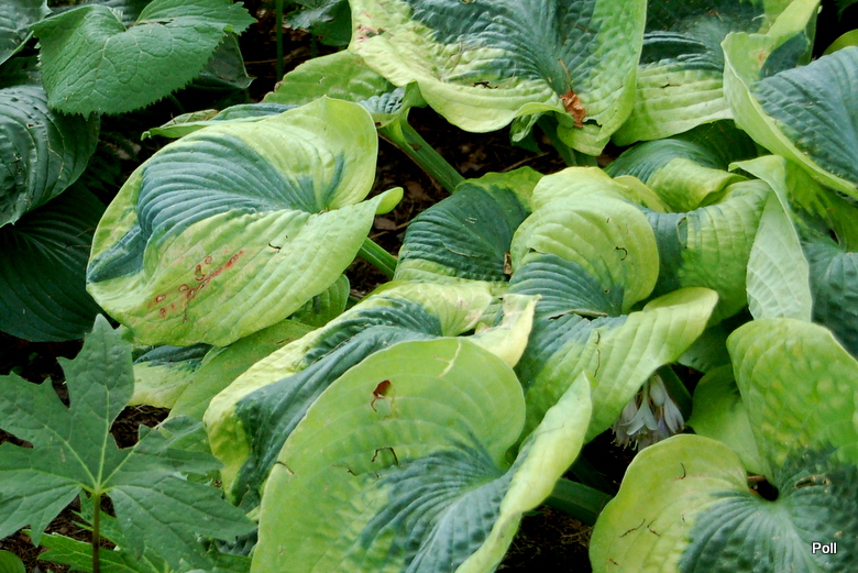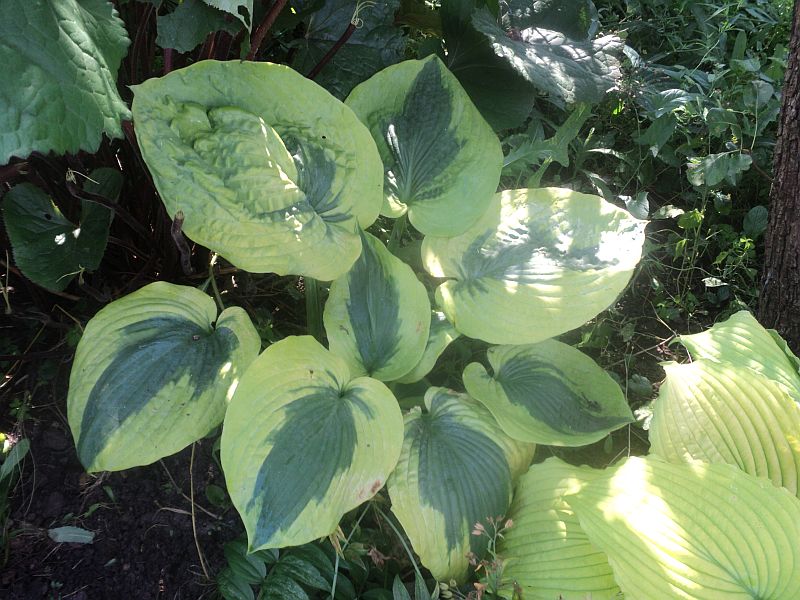 Trafiła Ci się jakaś trefna sadzonka, albo coś ją uszkodziło. Moja Sara's Sensation nie znosi zbyt godnie panujących upałów - liście są poparzone, choć rośnie w niemal całkowitym cieniu, na naprawdę chłodnym miejscu. Szkoda, bo gdyby nie odbarwienia od poparzeń, byłaby to naprawdę piękna hosta.