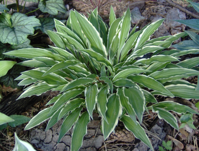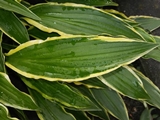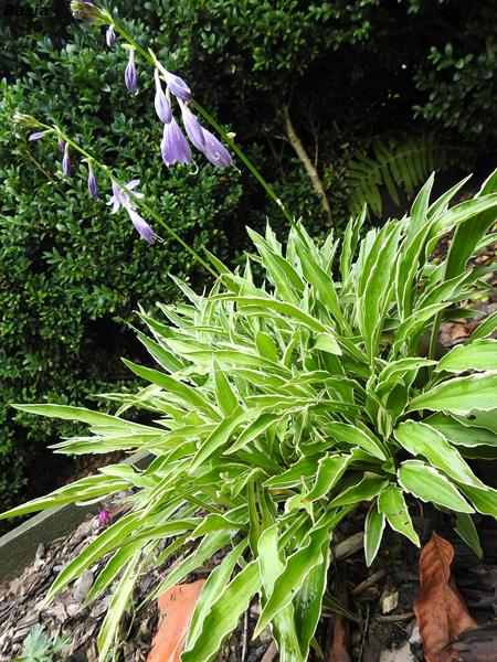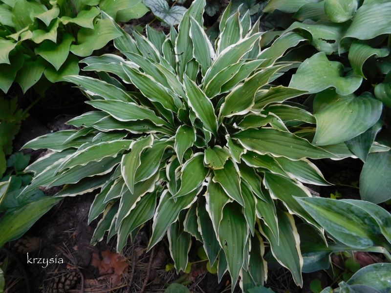 Liście: podłużne, 18 x 2 cm, zielone (zgaszona zieleń) , o żółtym, mocno pofalowanym i nieregularnym marginesie ; z upływem sezonu kolor żółty bieleje