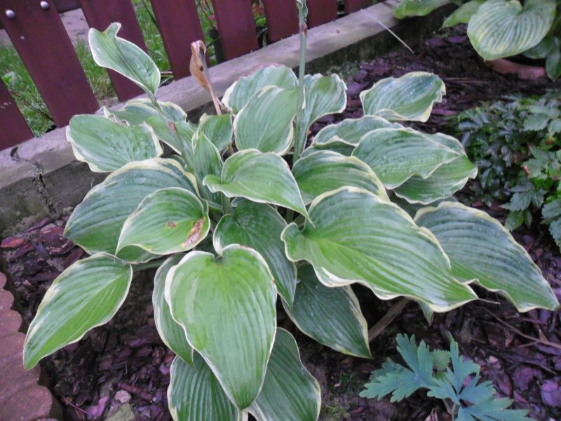 Liście: sztywne, duże (ponad 30 cm długości), sercowate; wiosną niebieskozielone z jasnozielonym , dośc wąskim, ale rozlewającym się w głąb liścia marginesem; w sezonie centrum staje się błyszczace, zielone a brzeg wyżółca się ; dobra substancja z lekkimi burchlami