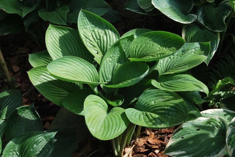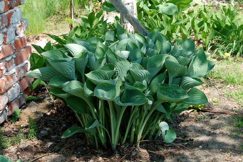 Liście: duże; przypudrowane i niebieskie wiosną, zaś w trakcie sezonu niebieskozielone z białym spodem