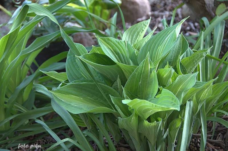 Rozmiar ML (50-60 cm wys.) Liście: podłużne, dobrej substancji; lekko falujący, szeroki niebieskozielony margines oddzielony jest od jaśniejszego, żółtozielonego centrum cienką biała linią Kwiaty: lawendowe Zalecane stanowisko: półcień