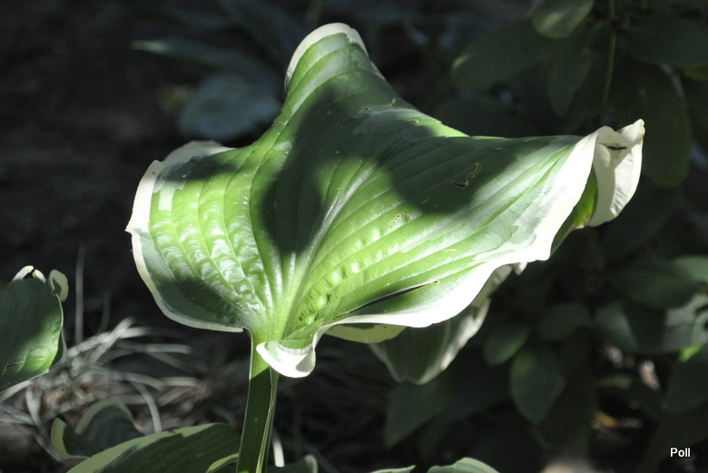 Liście: podłużne, ostro zakończone, mocno falujące, z dobrze widocznymi nerwami; wiosna jasnozielone z kremowym marginesem, w trakcie sezonu zieleń nieco ciemnieje a ściekający ku głównemu nerwowi margines się wybiela