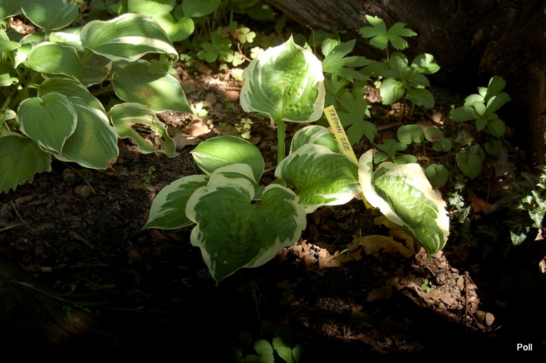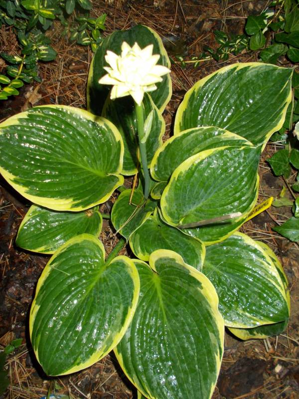 Rozmiar: ML (50-60 cm wysokości) Liście: sercowato-okragłe, grube, mocnej substancji; ciemnozielone z nieregularnym żółtym, bielejącym w trakcie sezonu, marginesem; błyszczące Kwiaty: bladolawendowe (VII) Zalecane stanowisko: od półcienia