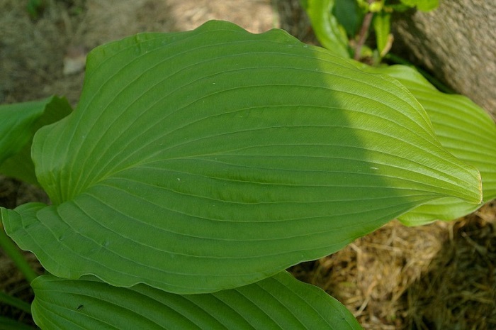 Liście: duże, błyszczące, jakby satynowe , z wyraźnie zaznaczonymi nerwami ; jasnozielone z pofalowanym brzegiem i ostrym, nieco zakręconym czubeczkiem