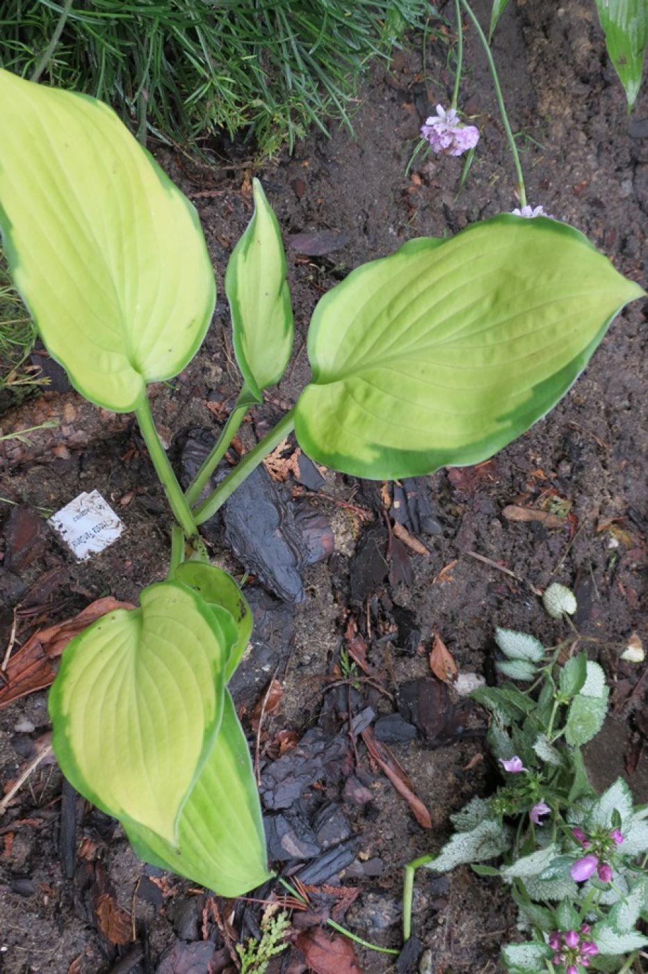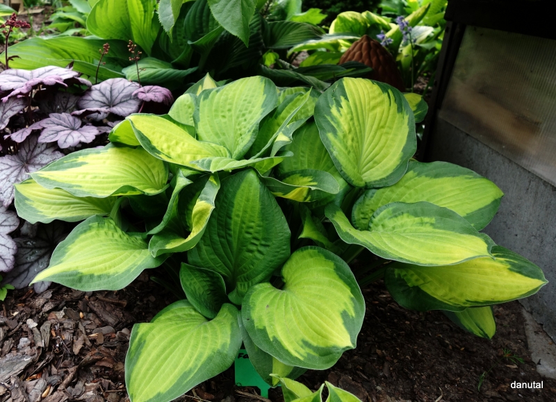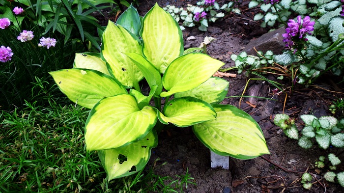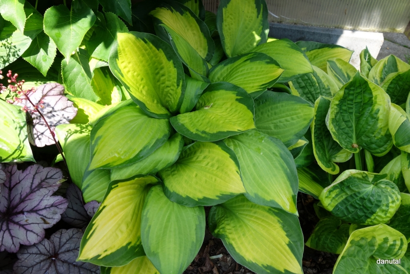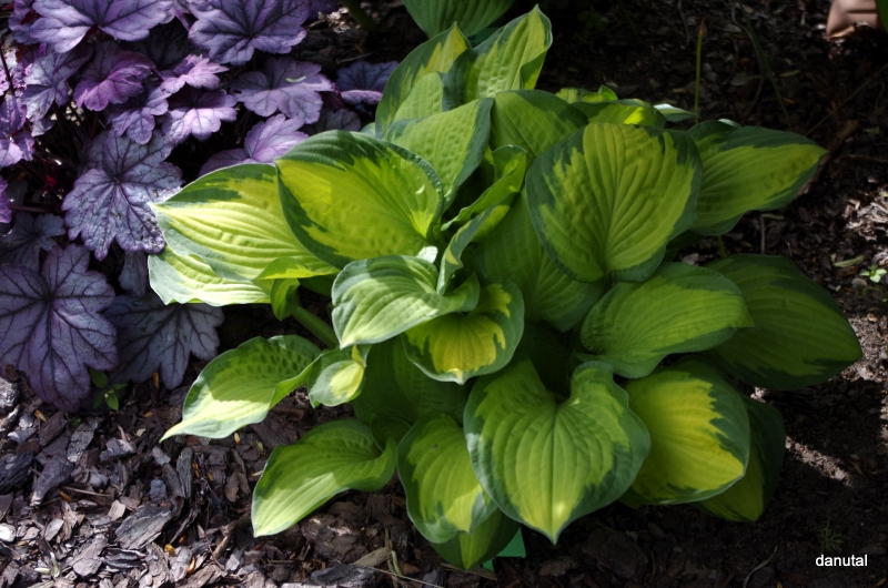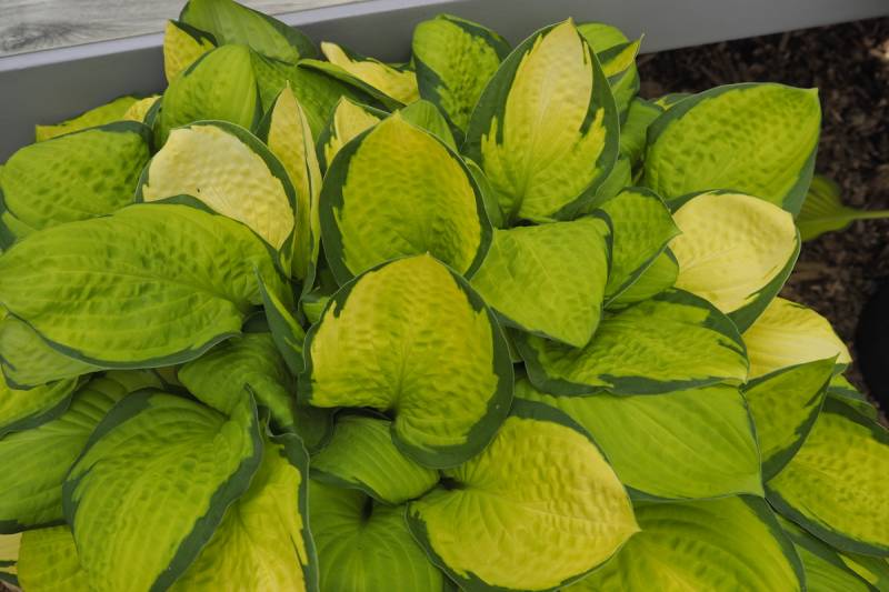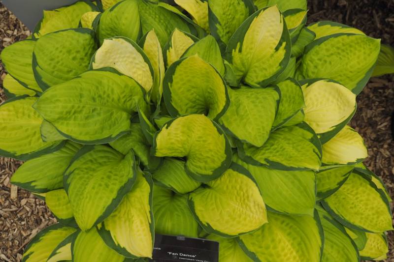 LIście: o rozmiarze około 18 x 10 cm; żółte centrum zmieniające się w trakcie sezonu do białego (w słońcu) z ciemnozielonym, nieregularnym marginesem