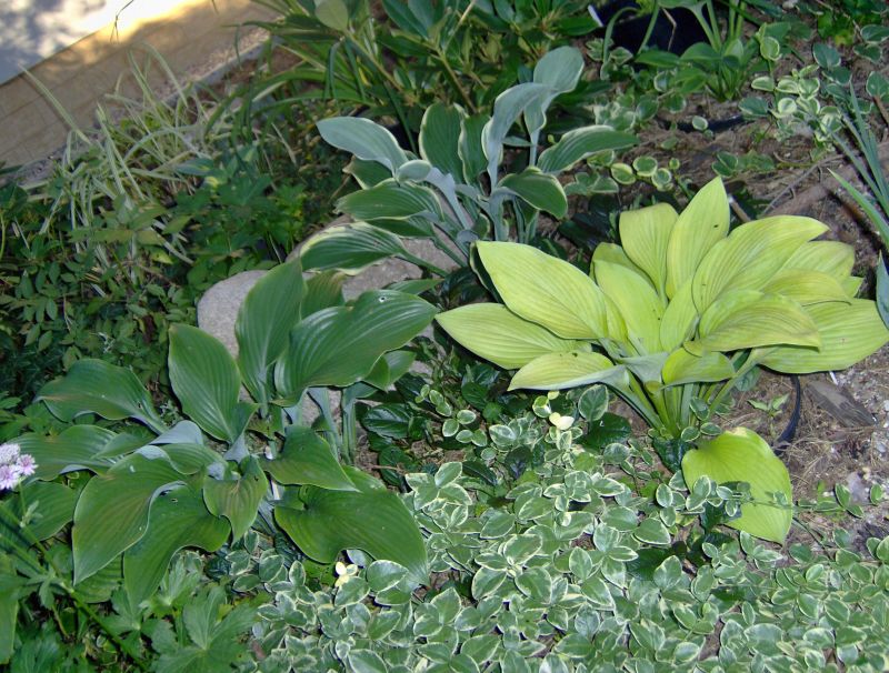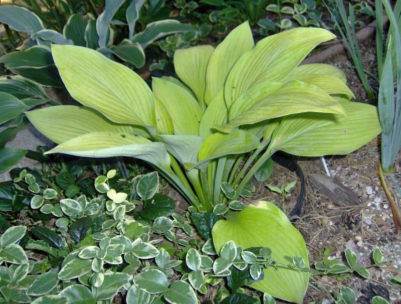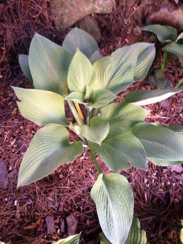 Liście: żółto złote, złote, wybarwiają się nierównomiernie, ze smugami, sztywne, lekko pokarbowane, spód pokryty sinym nalotem
