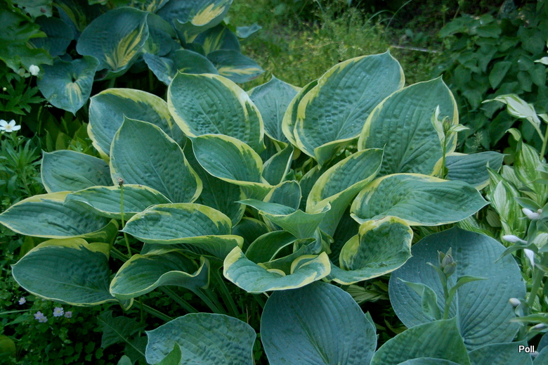 Co moge teraz o niej napisać? bardzo ciekawe wybarwienie - wiosną liście są lekko turkusowe a trzykolorowy, cieniowany margines wygląda pieknie i podkreśla ten odcień niebieskości.Powolna dość, ale warta zakupu, szczególnie dla wielbicieli dużych, mocarnych host.
