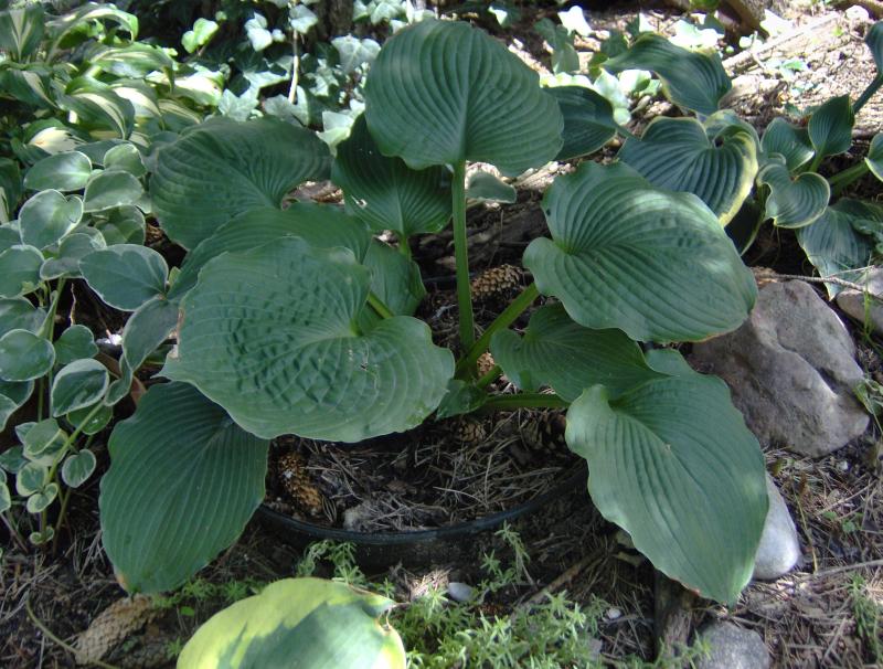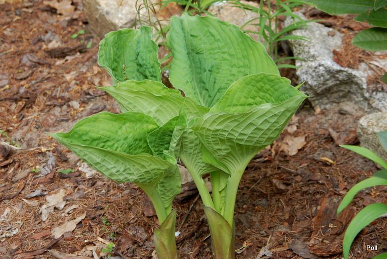 Rozmiar: VL wysokość 80-90cm Liście: duże, niebiesko zielone, okrągłe, mocno pofałdowane, grube, lekko błyszczące Kwiaty: blado lawendowe, Zalecane stanowisko: półcień/ cień, Uwagi: