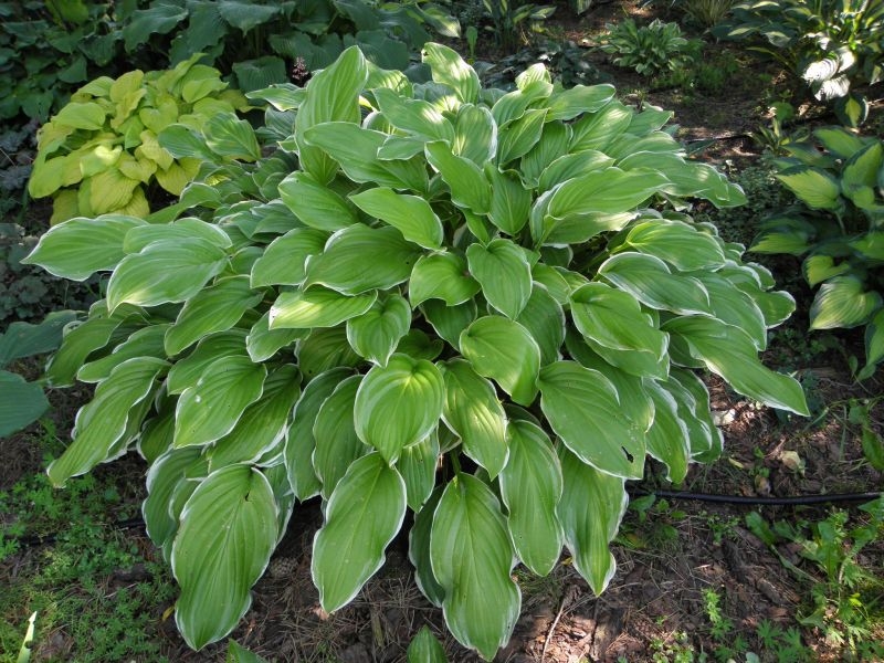 Hosta Sugar and Cream rośnie na jasnym, sporo podlewanym stanowisku.