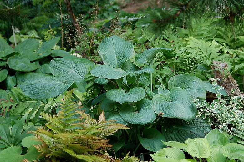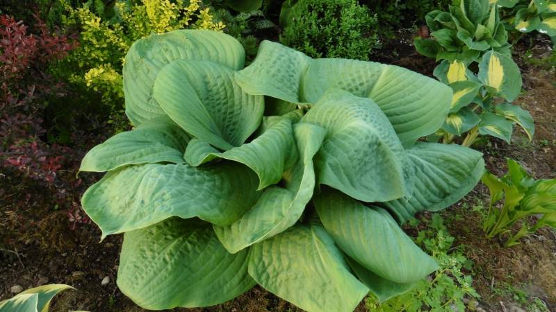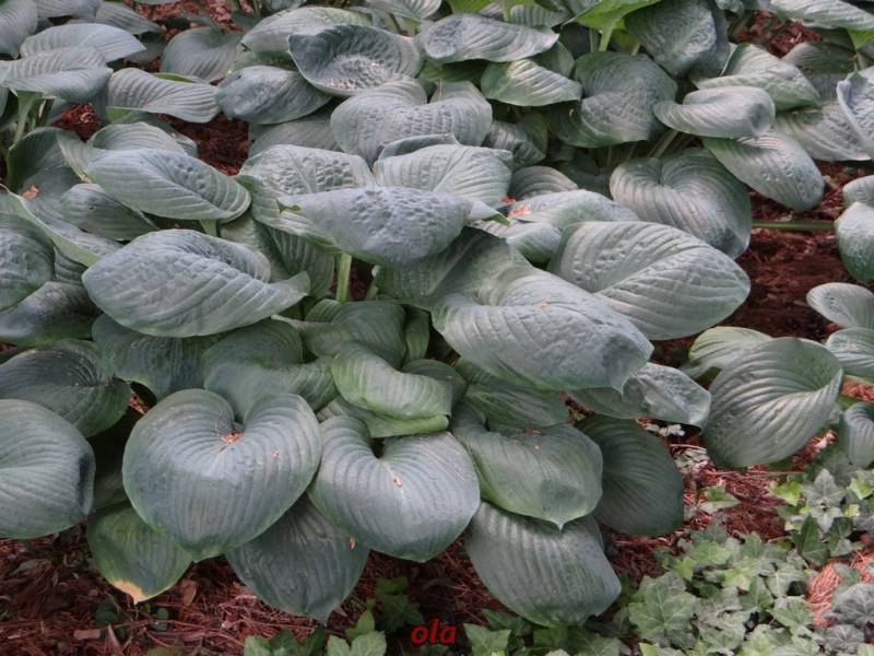 Hosta Blue Umbrellas po starciu wiosennego, matowego pudru, staje sie ciemna i błyszczaca