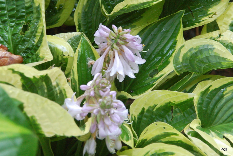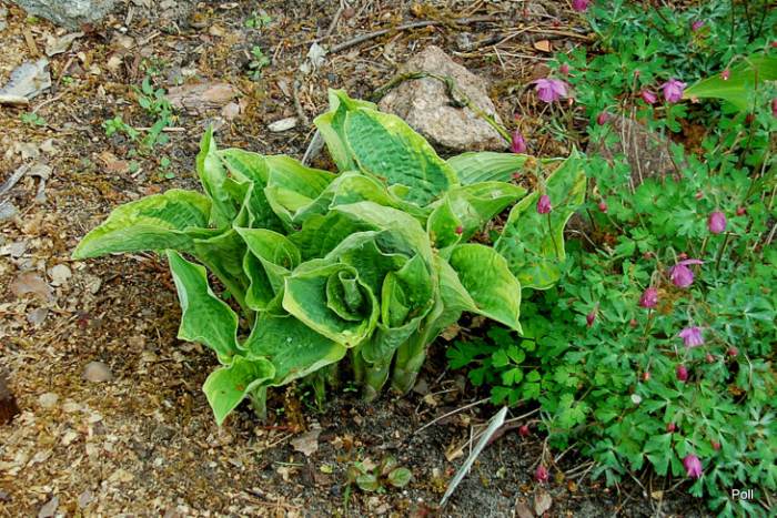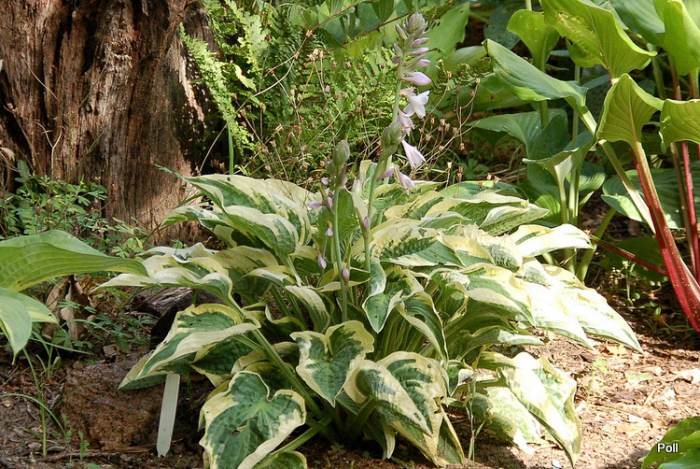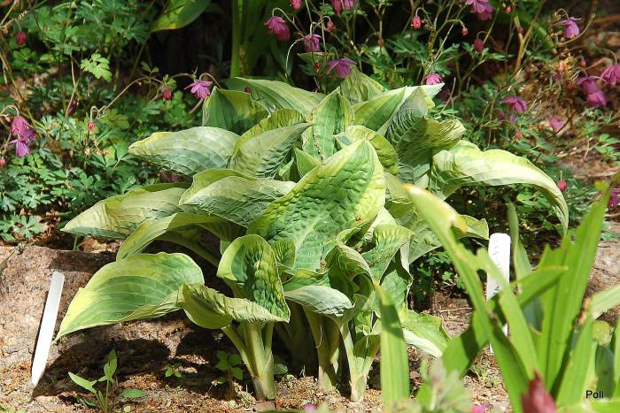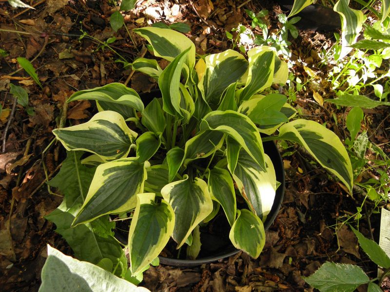 Rozmiar M wysokość 35-40cm Liście :sercowate , pofalowane, skierowane brzegami do wewnątrz przez co przypominają wygięte rondo kapelusza ; zielone ( wiosną niebieskawe) z żółtym , bielejącym w trakcie sezonu marginesem Kwiaty: lawendowe (VII) Zalecane stanowisko :odpółcienia