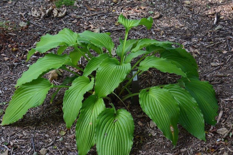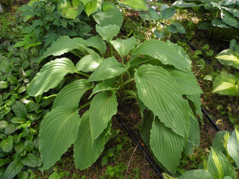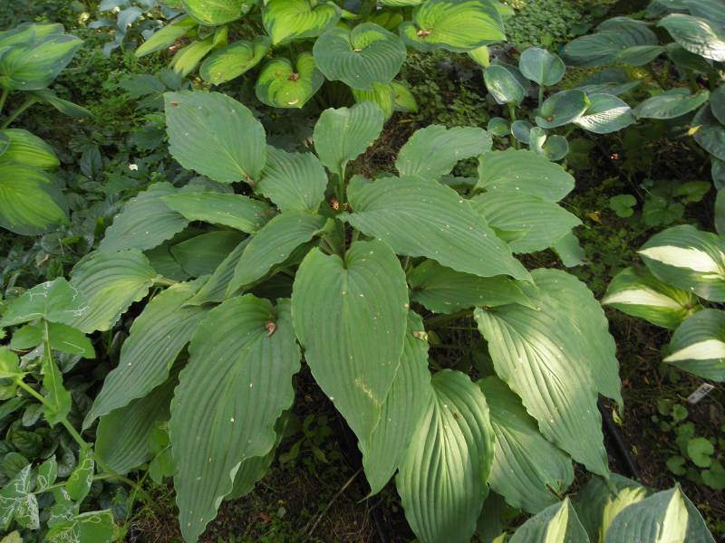 Rozmiar: L wysokość 55cm Liście: zielono-szare, wydłużone, z mocno falowanym brzegiem, wydatnym żyłkowaniem i białawym tyłem liścia; początkowa część łodyżek liściowych czerwona. Kwiaty: jasnolawendowe, kwitnie od połowy lipca Zalecane stanowisko: półcień, cień