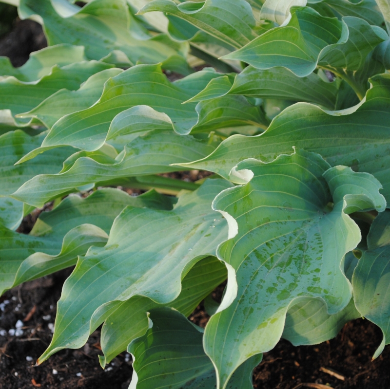 Rozmiar M. (40 cm wysokosci i do 90 cm szerokosci) Liscie: wiosna maja pudrowoniebieskie zabarwienie, w lecie staja sie niebieskozielone. Brzegi lisci podnosza sie ukazujac biala spodnia strone lsicia. Kwiaty: jasnolawendowe na polmetrowych pedach, w polowie lata.