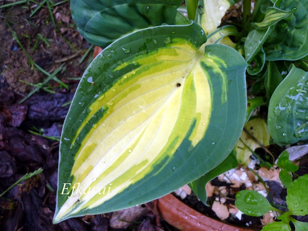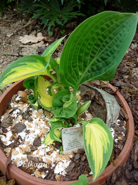 Obiecana fotka Happy Dayz Chwalić się nie ma czym, mało tego...Normalnie mnie denerwuje Nie wiem, jak rośnie u innych miłośników host, ale jak widać na naszym przykładzie - Ewci i moim - to hosta, którą trudno ogarnąć. Kupiona trzy lata temu u Fransena, jako 1-kłowa sadzonka z in vitro.