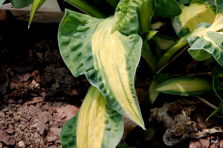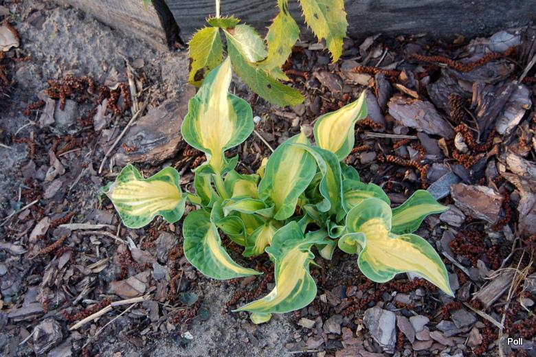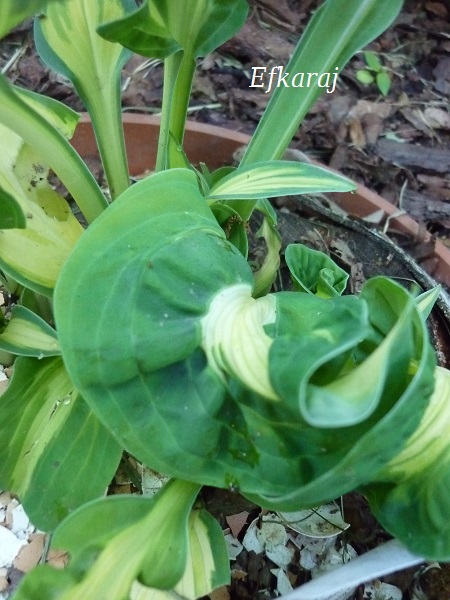W pełni hostowego sezonu stwierdzam, że jest to najbardziej zwariowana hosta w moim ogrodzie Zwariowana, w pozytywnym tego słowa znaczeniu. Liście... każdy nadal inny. Inaczej układają się kolory. Nie ma tu sztampowego w opisie marginesu, czy wypełnienia jakimś konkretnym kolorem środka. Wielkość liści jakby z kilku różnych host. Do tego część liści jest ładnie układająca się, a część radośnie powykręcana w różnych kierunkach. Jeszcze nie osiągnęła rozmiaru M. To taki rozczochrany, radosny maluch