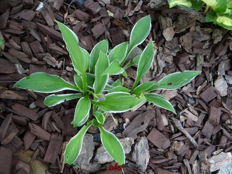 Rozmiar S wysokość 20-25cm Liście: wąskie... zielone z lekko falistym, białym marginesem i szarozielonymi smugami spływającymi w kierunku centrum Kwiaty: lawendowo purpurowe (VII/VIII) Zalecane stanowisko: słońce/ cień