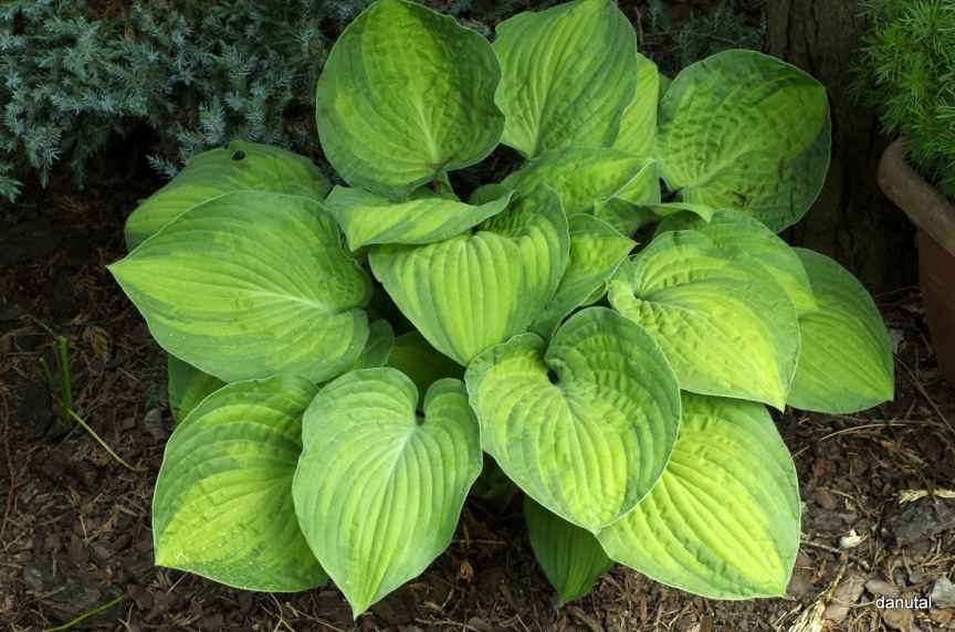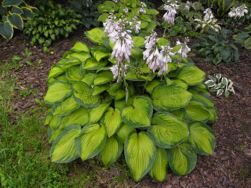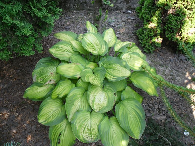 Rozmiar: M/L wysokość 60-65cm. Liście: dobrej substancji, pomarszczone, żółte, z zielonym szerokim marginesem Kwiaty: prawie białe na przełomie czerwca/lipca na 90 cm łodygach. Zalecane stanowisko: od słońca do cienia