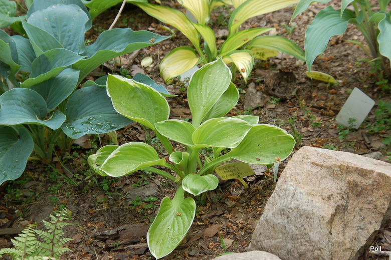 Rozmiar: M około 45cm wysokości Liście:wiosną lemonkowozielone z cienkim białym marginesem, w trakcie sezonu wyżółcaja się Kwiaty: wg Fransena bladolawendowe (nie potwierdzę, bo u mnie nie kwitła) Zalecane stanowisko: półcień