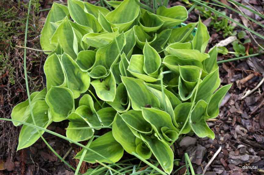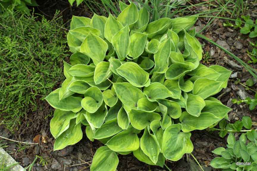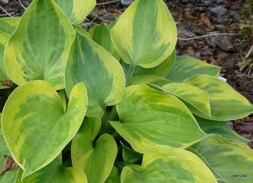 Rozmiar: S/M wysokość 25-30cm. Liście: grube,sercowate z zielonym centrum i żółtym, nieregularnym marginesem Kwiaty:lawendowe na wysokich 60 cm łodygach /VI-VII/ Zalecane stanowisko: od słonecznego do cienistego Uwagi: