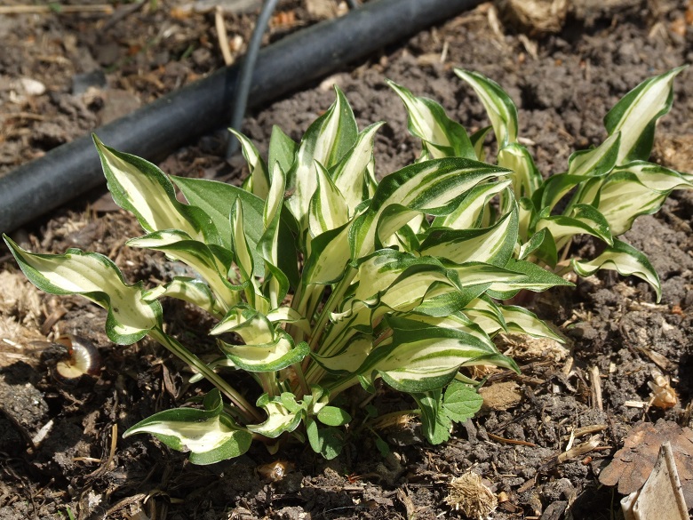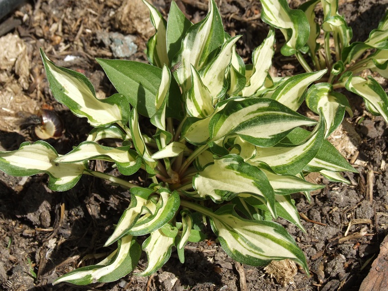 Rozmiar D wysokość 15cm Liście: wąskie, podłużone, lekko skręcone... białe centrum z nieregularnym, delikatnie pofalowanym, ciemnozielonym marginesem Kwiaty: lawendowo purpurowe (VI/VII) Zalecane stanowisko: półcień/ cień