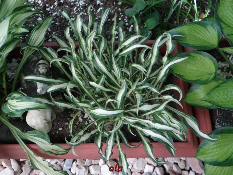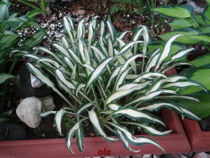 Rozmiar S wysokość 15-20cm Liście: lancetowate, lekko skręcone... czysto białe centrum z mocno pofalowanym, ciemnozielonym marginesem... matowe na górze, lekko błyszczące od spodu Kwiaty: bladopurpurowe (VII/VIII) Zalecane stanowisko: półcień/ cień
