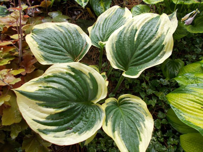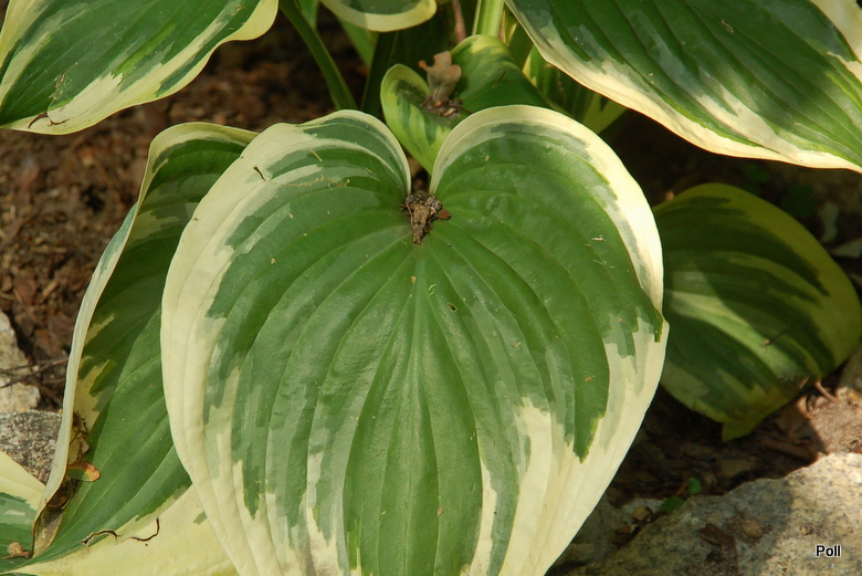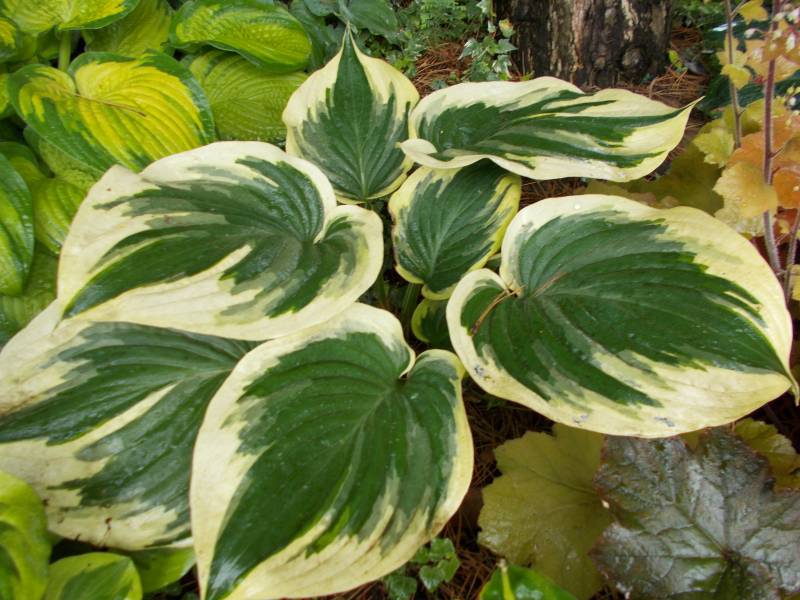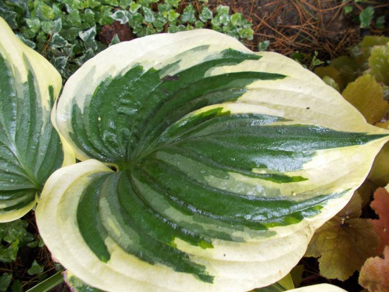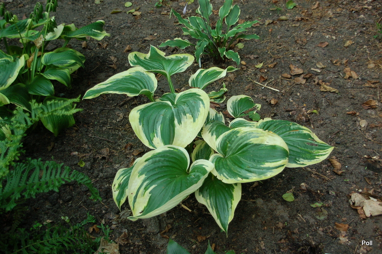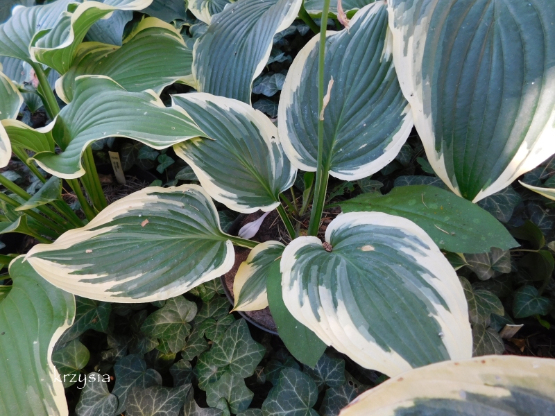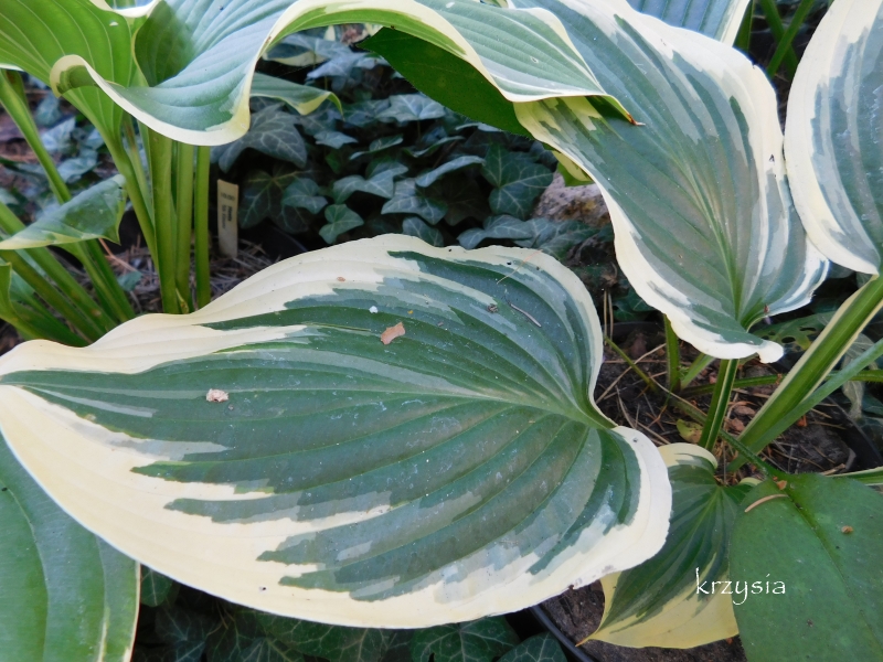Liście: sercowatego kształtu, o dobrej substancji i mocno odznaczających sie nerwachi, z połyskiem; zielone centrum otoczone jest bardzo szerokim, nieregularnym, kremowym marginesem - wiosną margines jest żółty