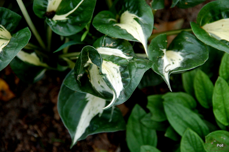 Liście: sercowate, mocno powykręcane, bardzo twarde i sterczące do góry, sprawiają wrażenie plastikowych; białe, nakrapiane na zielono centrum, z ciemnozielonym, szerokim marginesem