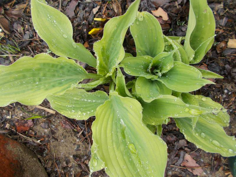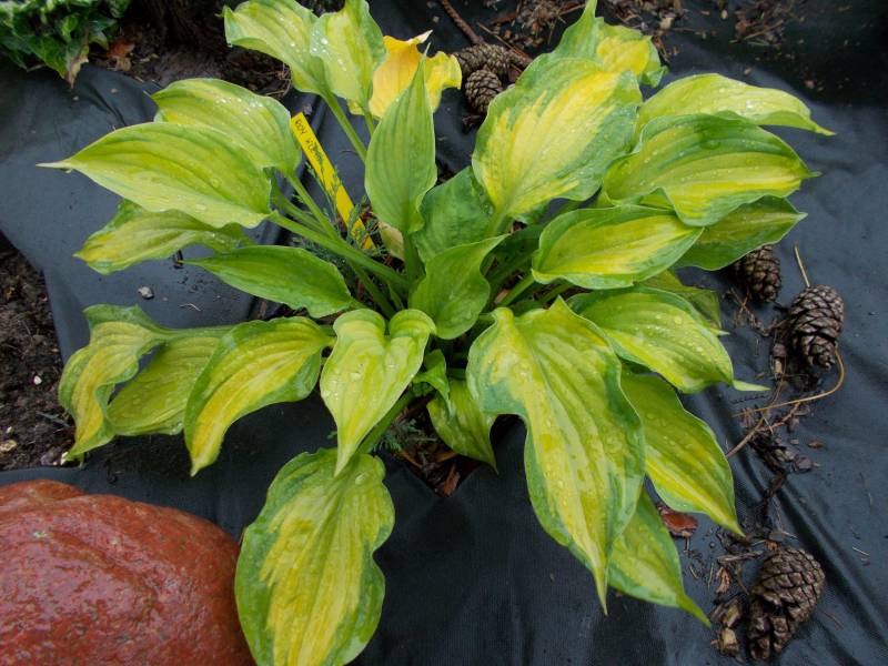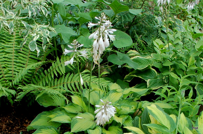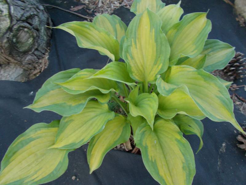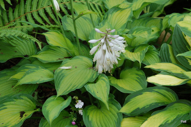 Wielkość - wysokość 60-65 cm Liście - żółte z szerokim zielonym marginesem , lekko falujące Kwiaty - jasno lawendowe Wzrost - średni Stanowisko - cień , półcień