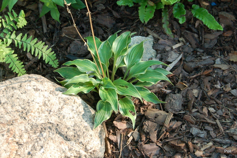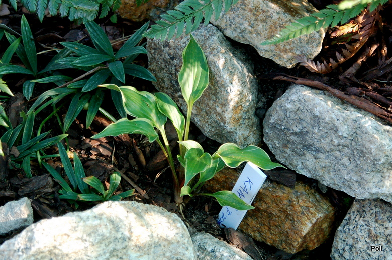Rozmiar DS (15 - 20 cm wysokości) Liście: dość wąskie, falujące; ciemnozielone z z nieregularnym żółtym marginesem(wiosną zielonkawym), wlewającym się do centrum; błyszczące, osadzone na bordowo podbarwionych ogonkach Kwiaty: lawendowe, okres kwitnienia przypada na VII/VIII Zalecane stanowisko: półcieniste do niezbyt głębokiego cienia