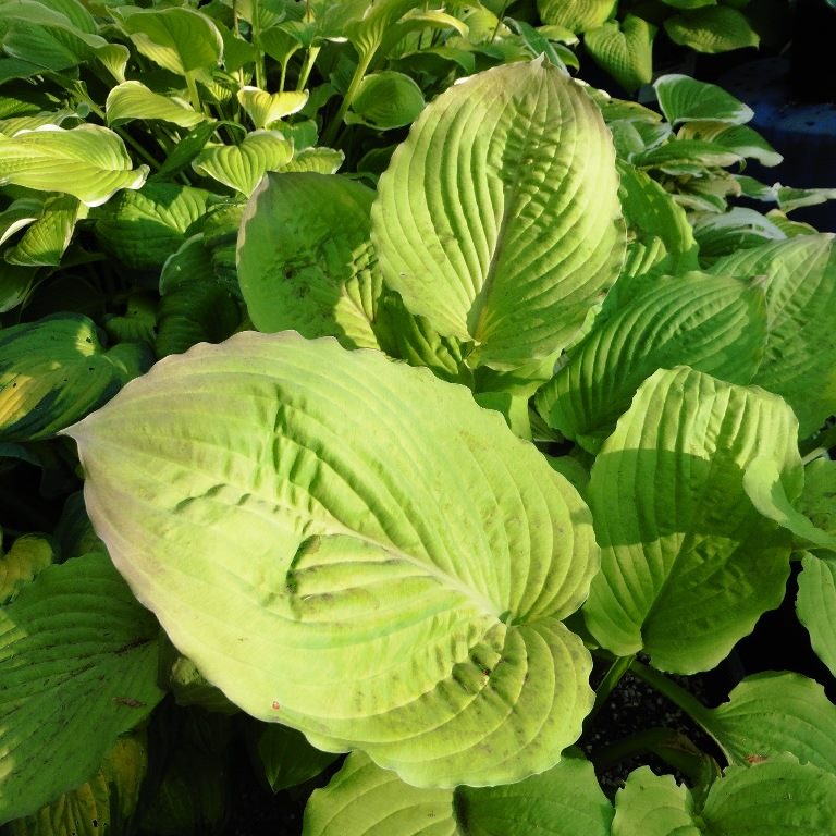 Rozmiar L 50-55cm Liście zielono-cytrynowe na wiosnę, zmieniają barwę na zgaszony złoty latem, wierzch liścia z połyskiem i wyraźnym zyłkowaniem. Brzeg z falbanką. Starsze liście z burchlami. Kwiaty ciemno lawendowe, purpurowe u nasdy na ciemnych pędach, kontrastujących z jasnymi liśćmi. Kwiatną w sierpniu. Zalecane stanowisko półcień.