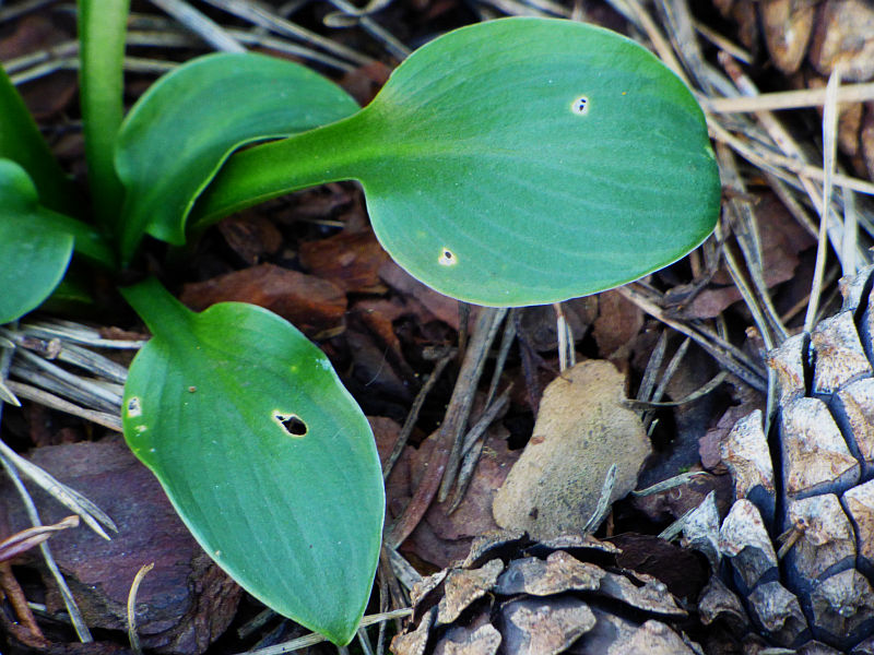 Liście: okrągłe, twarde... niebieskawe centrum z początkowo żółtawo zielonym, następnie zielonym marginesem