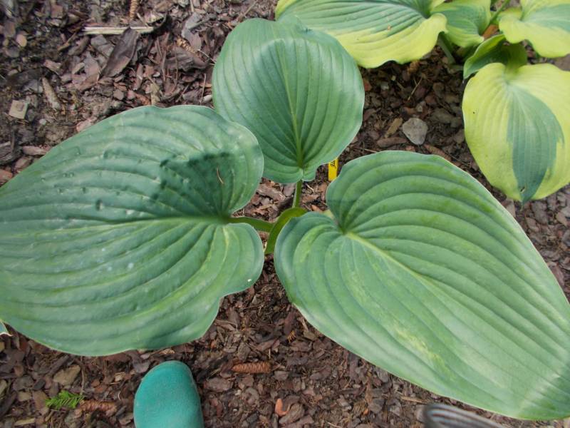 Rozmiar - L (wysokość 60-80cm.) Liście - zielone , błyszczące, podłużne, sercowato wklęśnięte przy ogonkach, wzniesione do góry, z wyraźnym żebrowaniem. Kwiaty - prawie białe z fioletowymi pylnikami, lekko pachnące, na wysokich łodygach , niezbyt dekoracyjne, kwitnie lipiec/sierpień. Stanowisko - od półcienia do cienia.