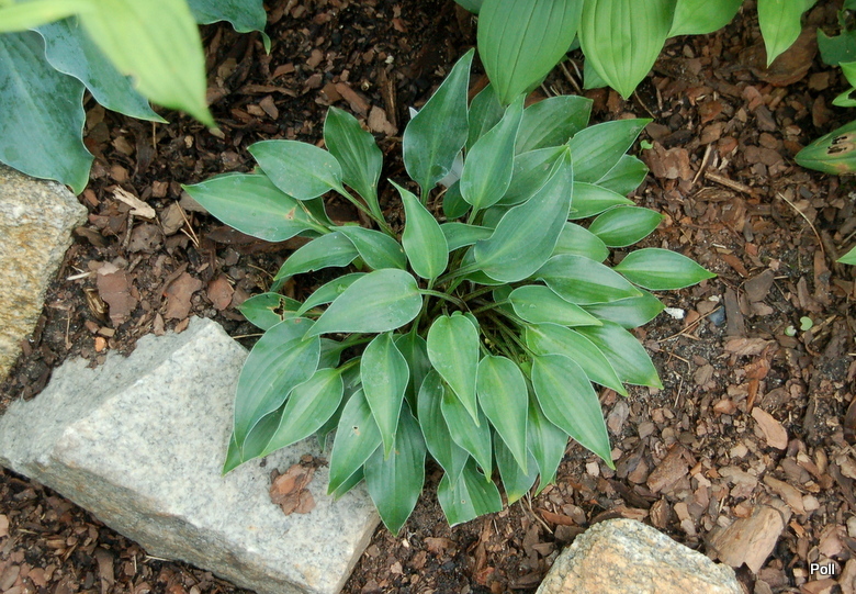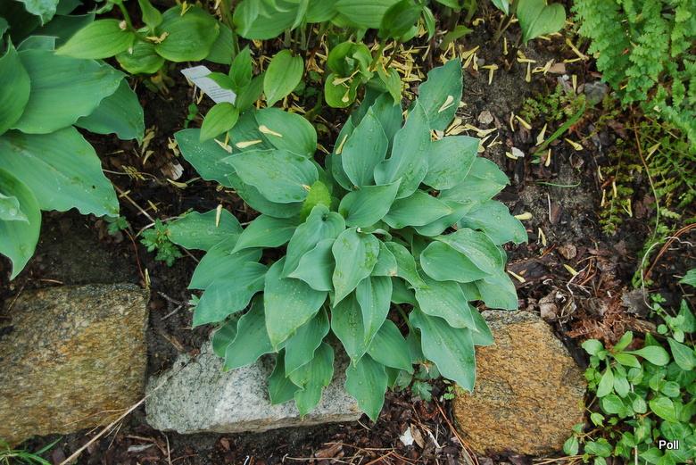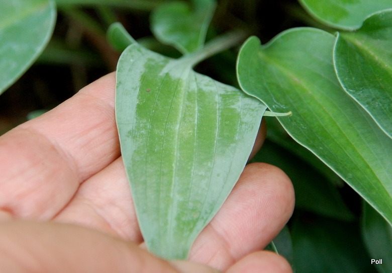 Liście: nieduże, o wymiarach 11x 6 cm, sercowato-podłużnego kształtu, nieco wzniesione sztywno ku górze i osadzone na nieco podczerwienionych ogonkach ; niebieskoszare, lekko falujące; wiosną pokryte puderem, sprawiającym wrażenie, że są matowe; spód liścia także przypudrowany