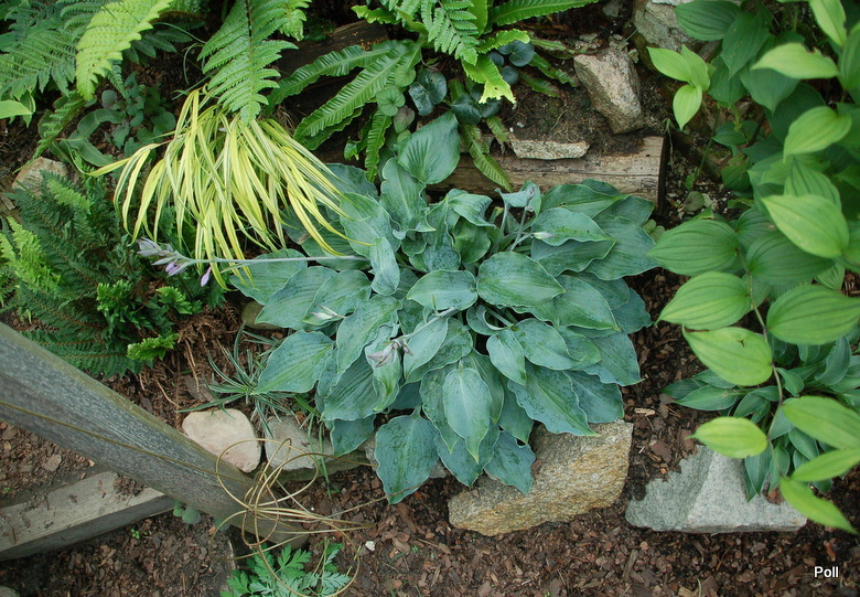 Bubbatini wsród innych roślin - w centrum niebieska hosta