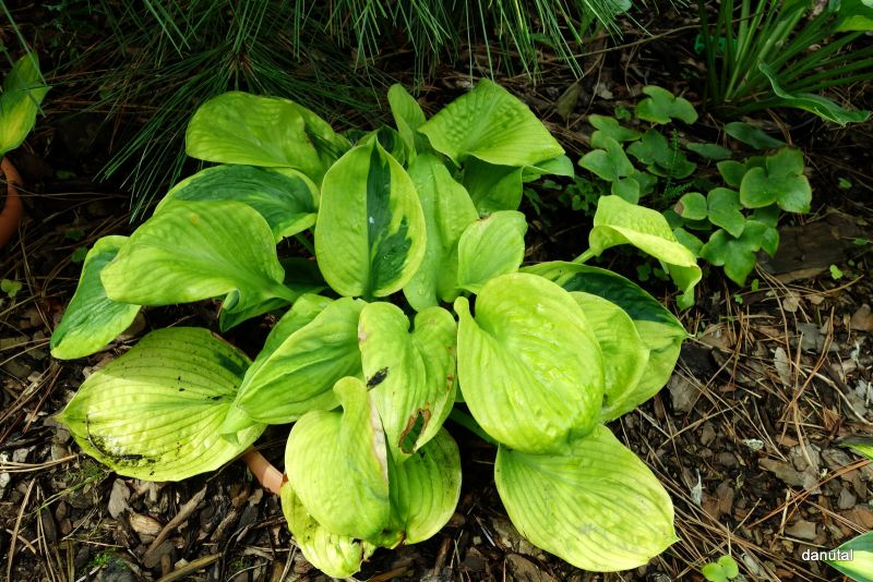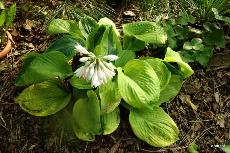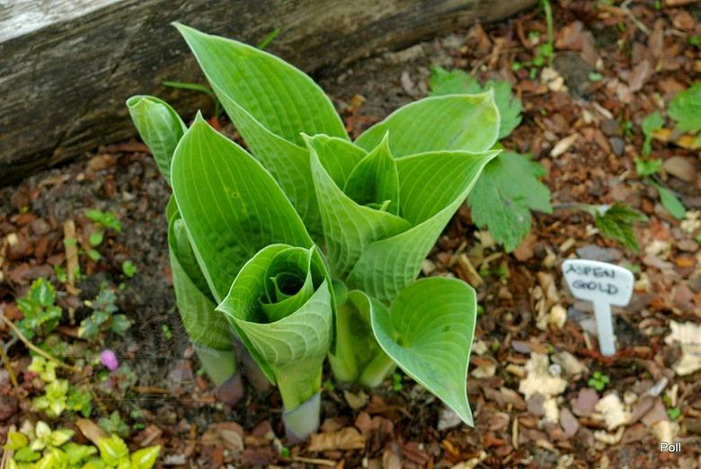 Na jasnych stanowiskach z dostępem do rozproszonych promieni słonecznych, hosta Aspen Gold miejscami pięknie się wybarwia na złoty kolor