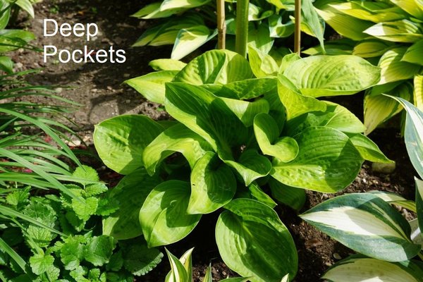 Hosta Deep Pockets w trzecim sezonie uprawy. Rosnie na stanowisku mocno podlkewanym, o wystawie wschodniej i słońce dochodzi do niej przez około 4 godziny dziennie