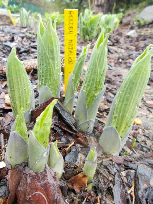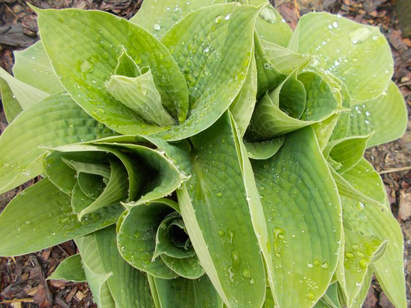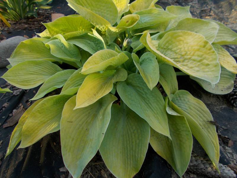 Rozmiar M ( wysokość do 40 cm ) Liście - żółte, mocno pofałdowane, zaokrąglone, dobrej substancji Kwiaty - prawie białe Stanowisko - od cienia do półcienia Wzrost - średni