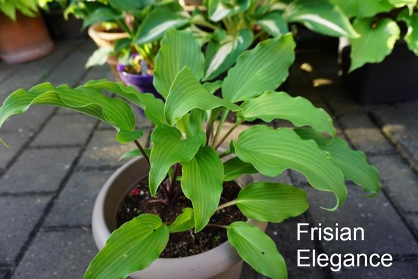 Rozmiar M wysokość 35-40 cm Liście: podłużne ze spiczastym i podkręconym wierzchołkiem... satynowozielone o pofalowanych brzegach... osadzone na purpurowo czerwonych łodyżkach Kwiaty: bladolawendowe z purpurowymi paseczkami (VIII/IX) Zalecane stanowisko: półcień/cień