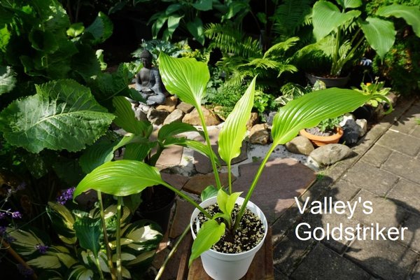 Rozmiar M wedle danych rejestracyjnych ma osiągać 35 cm wysokości przy 40 cm szerokości Liście: lancetowate o wymiarach około 25 x 10 cm... złociście żółte, błyszczące, z mocno pofalowanym marginesem i białym spodem... dobrej substancji Kwiaty: jasnolawendowe (VIII/IX) na 80 cm łodygach Zalecane stanowisko: pólcień/cień